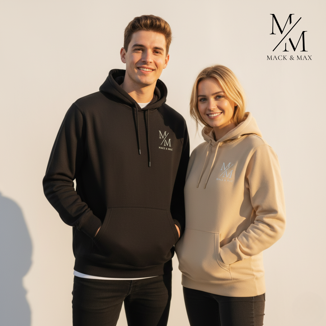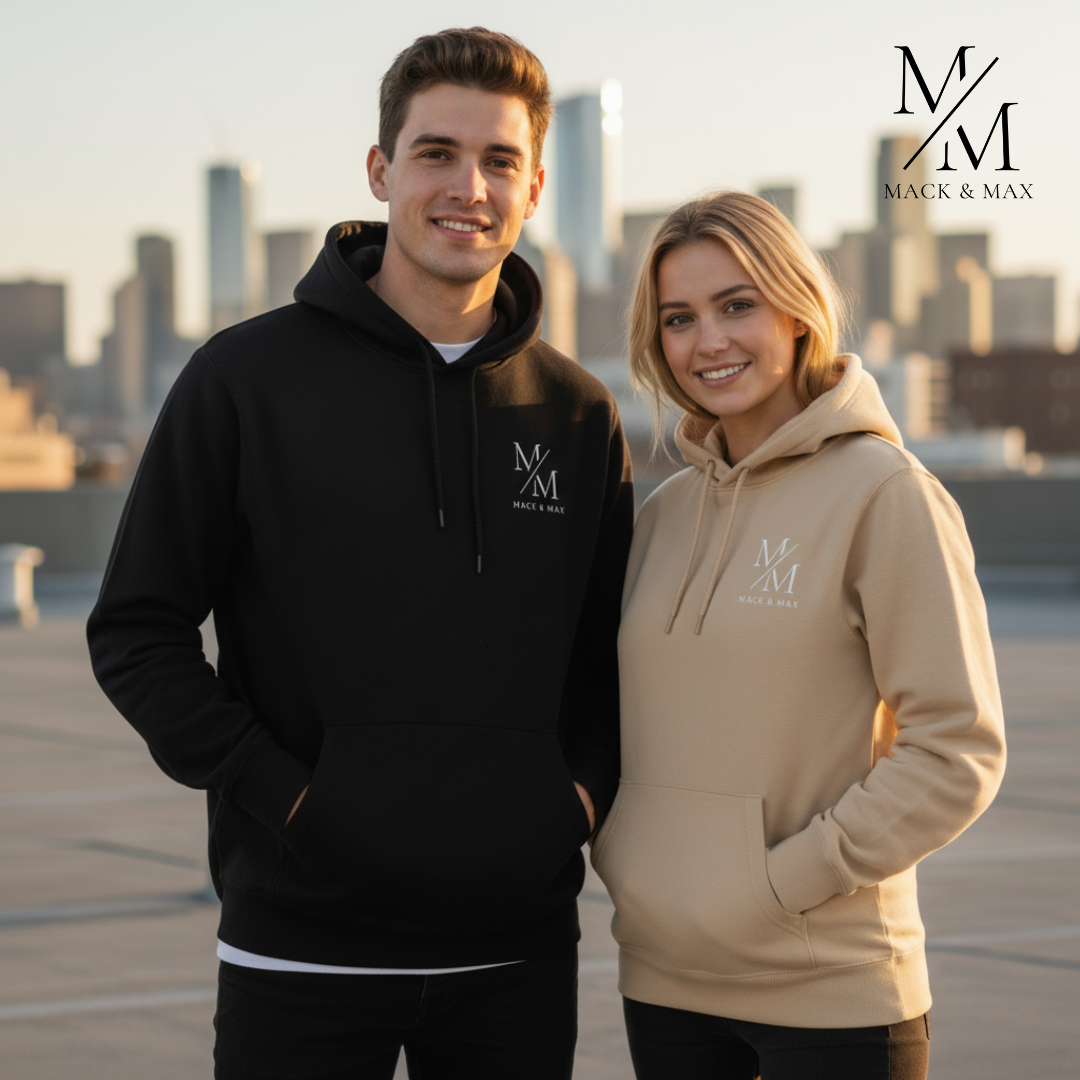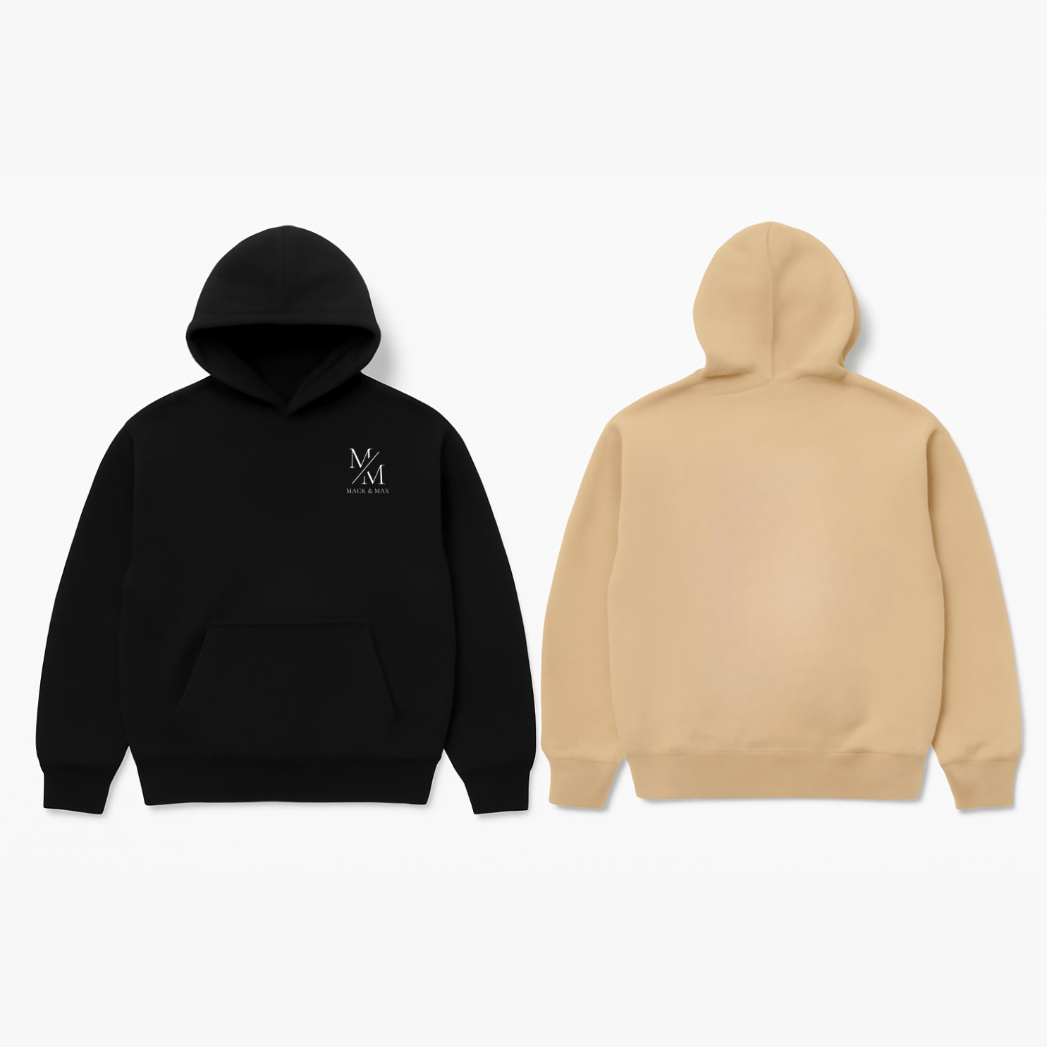 & Free Shipping350 GSM double biowashed 100% cotton fleece hoodie by Mack and Max™—plush, durable, fade-resistant and ultra-comfortable in Black and Beige.